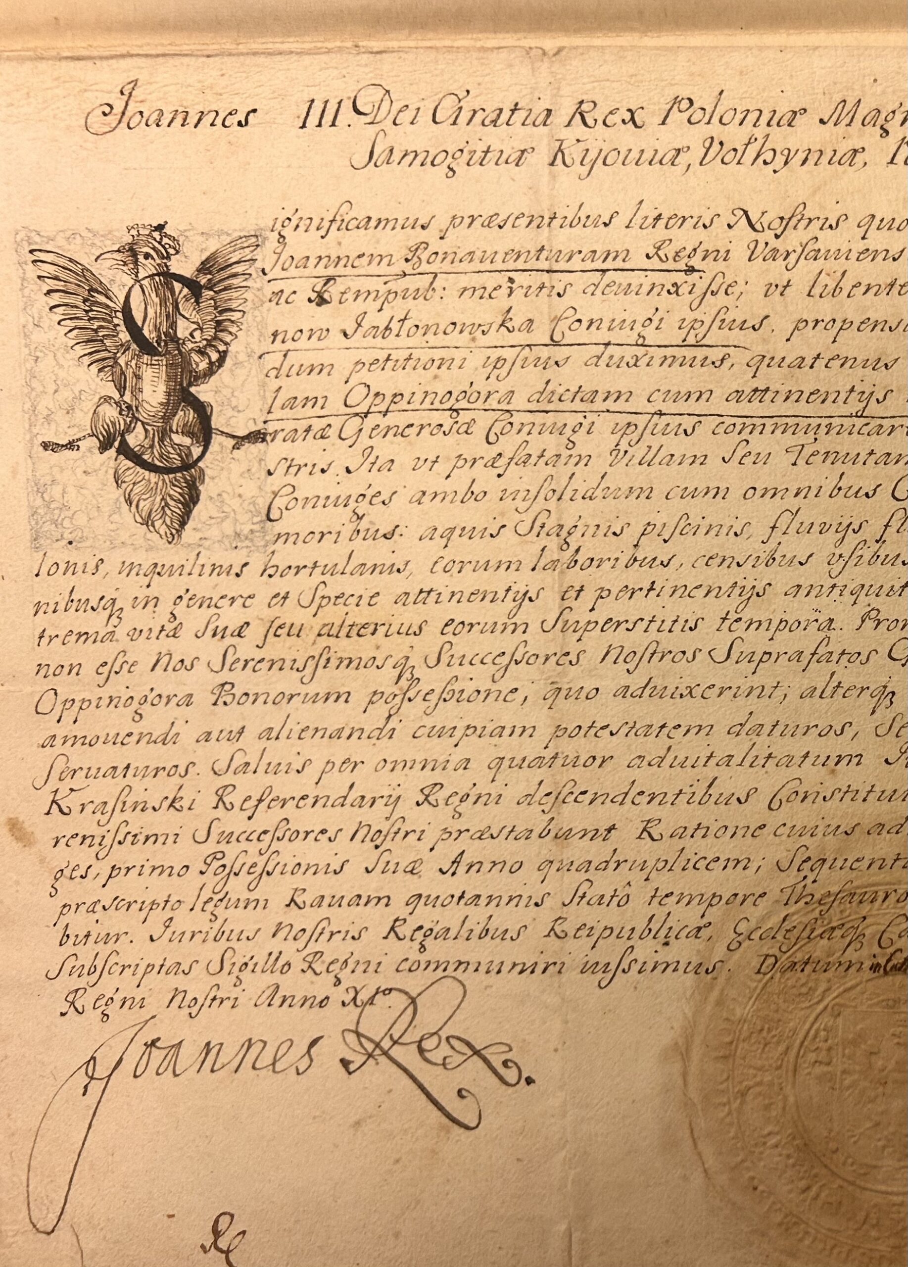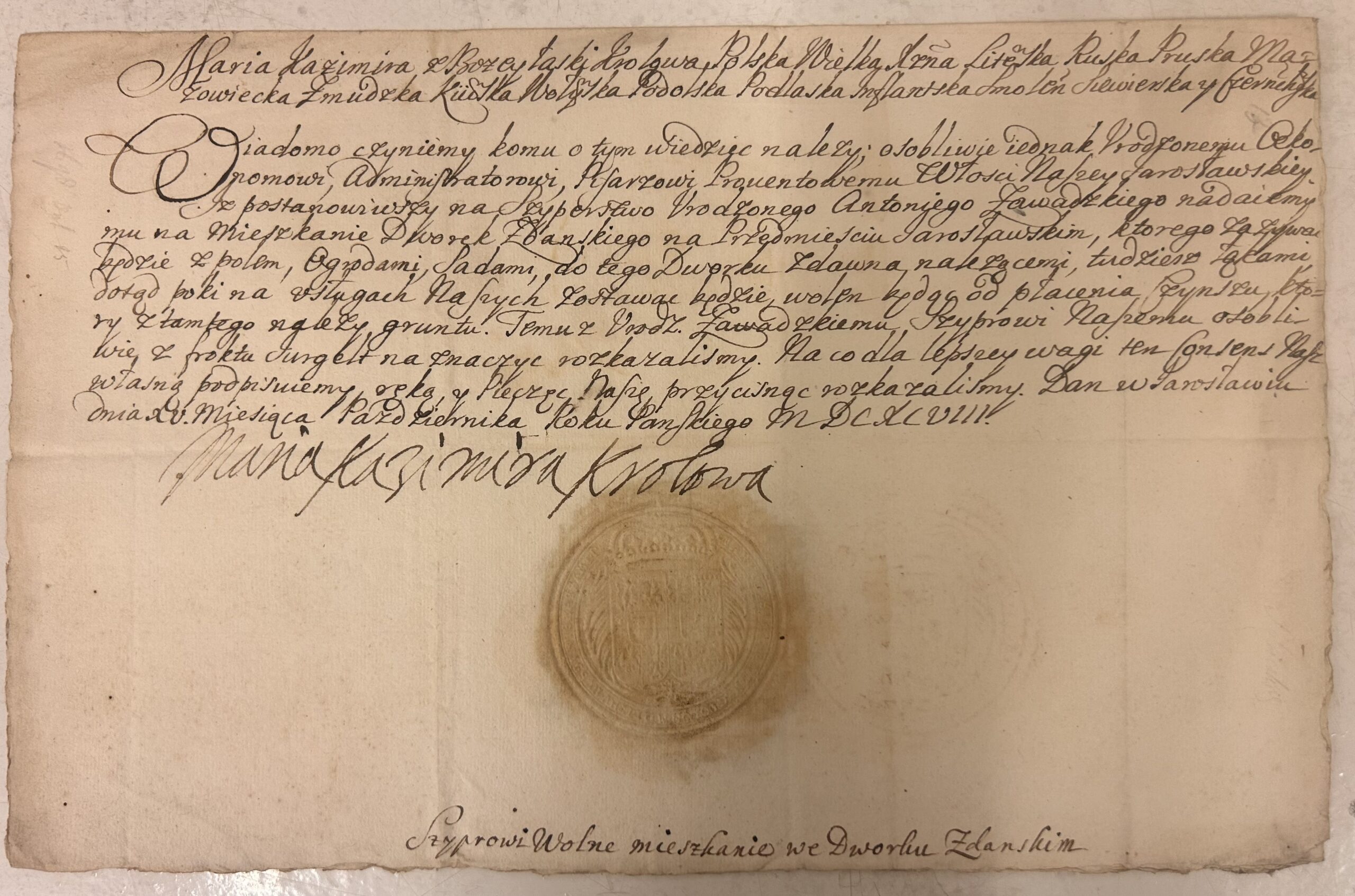 - akt podziału majątku pomiędzy synów Jana III Sobieskiego z 1698 r. z podpisem królowej Marii Kazimiery